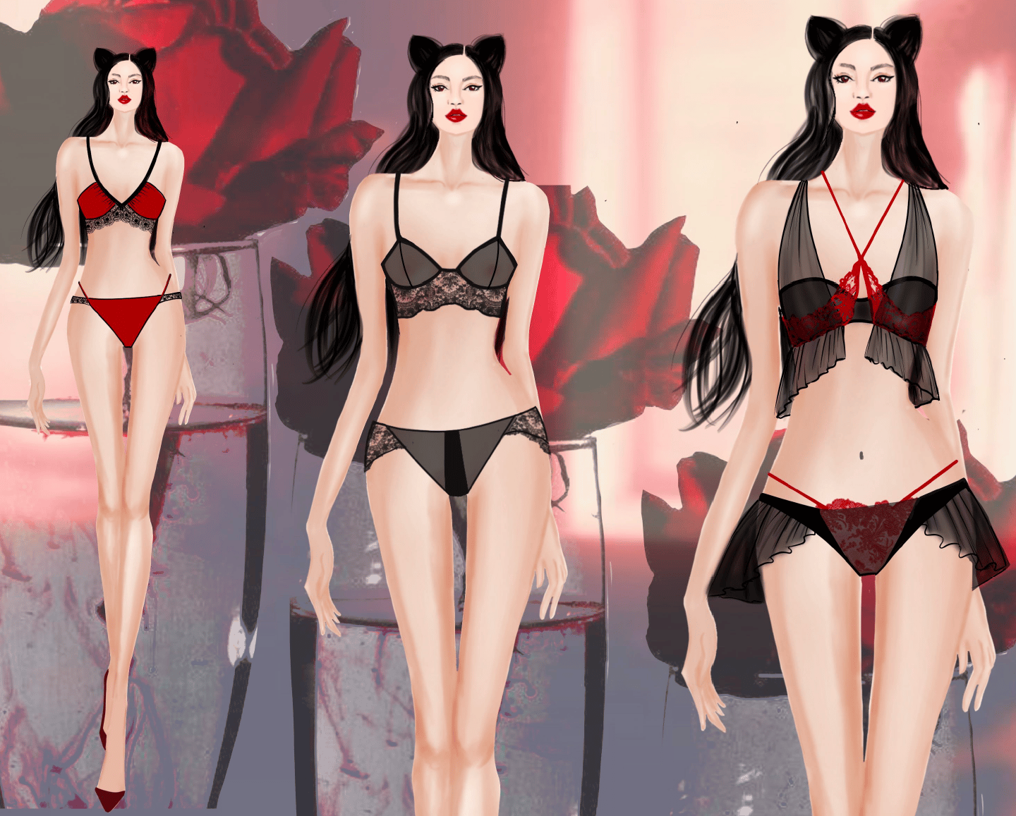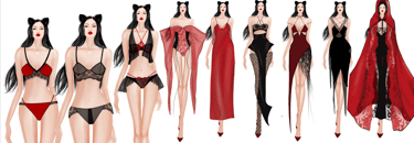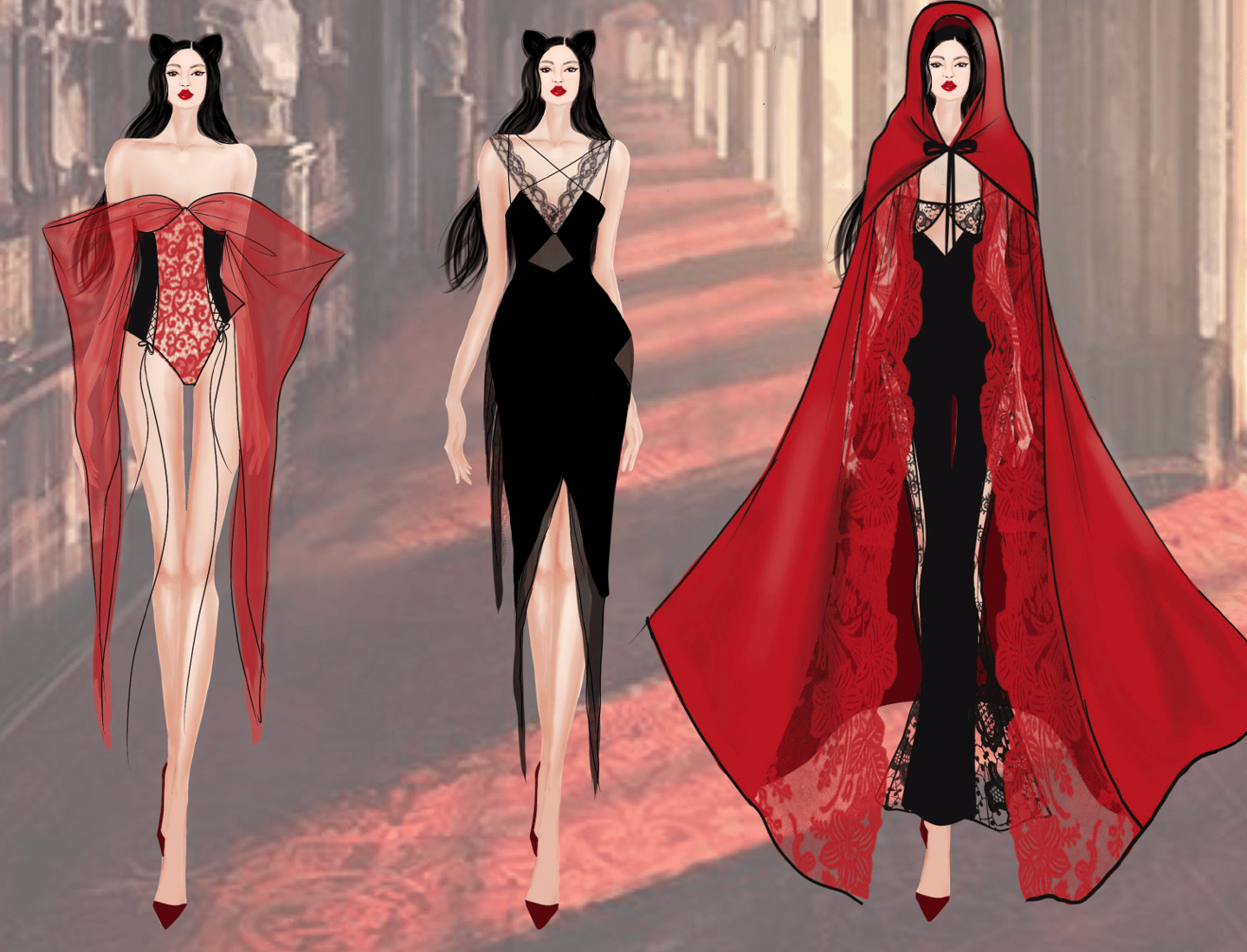 transitions from lingerie to eveningwear with a striking red and black palette, highlighting sensuality and femininity.